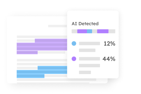 El indicador de escritura con IA muestra un porcentaje general de texto probablemente generado por IA en el trabajo de un estudiante, con un reporte que resalta los segmentos de texto que nuestro modelo predice que fueron generados por IA.